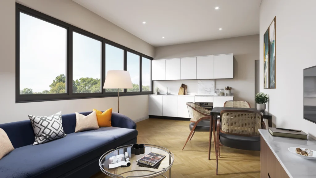 Each apartment at Forum House showcases a high specification, featuring handleless kitchens fitted with Bosch appliances, sleek quartz worktops, and stylish porcelain-tiled bathrooms. Residents benefit from app-enabled heating and lighting controls and pre-installed gigabit-fibre broadband connections for seamless modern living.